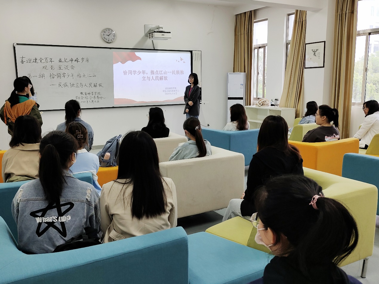 本次观影座谈活动共有四期,本期为第一期,主题为“恰同学少年,指点江山——民族独立与人民解放”。九点活动开始,主持人播放关于民族独立和人民解放运动的影片,并提出有关影片内容的三个问题,要求同学们在观影过程中边看边思考,更加深刻地去了解影片所体现的深意。影片播放结束后,进行分享交流环节,同学们都积极主动地分享了自己此时此刻观看影片后的真实感受,没有当场分享感想的同学于观影结束后也在活动群中纷纷发表感想。