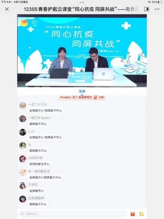 为助力全市疫情防控工作大局,教工第三支部党员参与团市委组织的“同心抗疫,同屏共战”12355青春护航云课堂活动。4月17日厉飞飞围绕主题《积极心态与自我成长》做了专题访谈,通过在线心理课堂帮助青少年缓解疫情期间的心理焦虑、减轻不良情绪,调整积极心态面对学习生活。