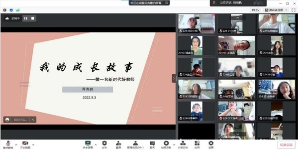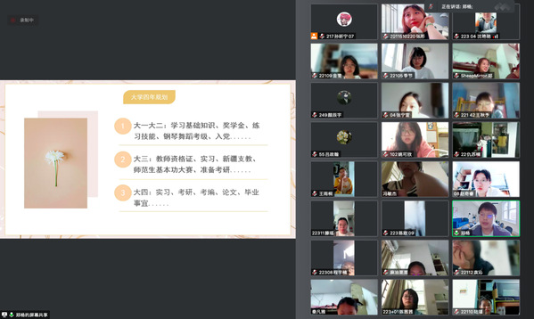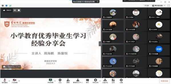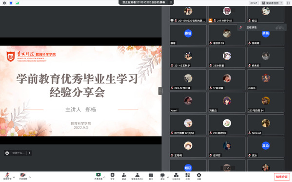 2022年9月3日上午,郑杨学长作为学前教育优秀毕业生代表,在腾讯会议为全体学前教育新生举行了经验分享会。会议主要向2022级同学分享关于大学四年在校期间的学习生活规划、多彩的校园生活以及学前教育未来的方向选择等内容。