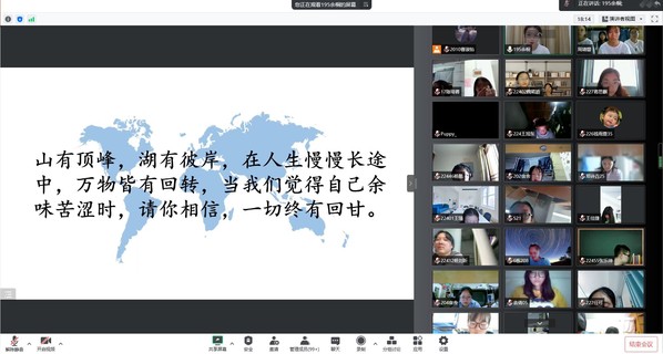 会议最后余桐学姐与新生们积极互动,耐心解答各种问题,并给予未来寄语:山有顶峰,湖有彼岸,在人生漫漫长途中,万物皆有回转,当我们觉得自己余味苦涩时,请你相信,一切终有回甘。