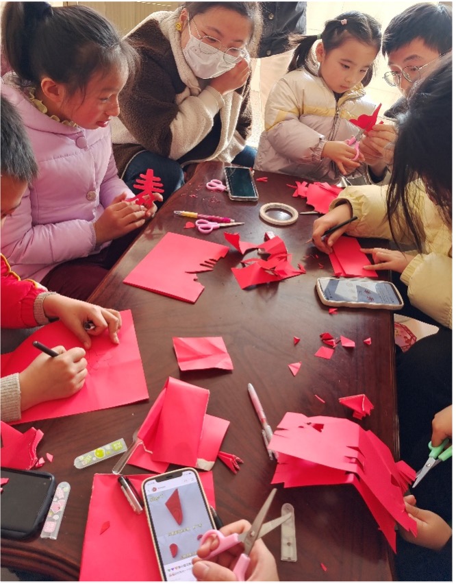 教科院的员工提前准备了制作灯笼和剪纸的手工材料,与现场的小朋友们通过手工装搭的方式,在他们的指导和帮助下,制作出了一个个精美的元宵灯笼。同时为增加活动的趣味,他们在制作好的灯笼下挂上妙趣横生的小灯谜,让小朋友们在潜移默化中接受传统文化知识的洗礼和熏陶。猜灯谜环节过后,他们又拿起了彩纸和剪刀,有的剪下“福”和“春”,有的剪出俏皮可爱的兔子,伴随着沙沙的剪纸声和孩子们欢笑声,一片片彩纸落下,一幅幅惟妙惟肖的剪纸显现出来,小朋友们的脸上洋溢着满满的幸福感和成就感。