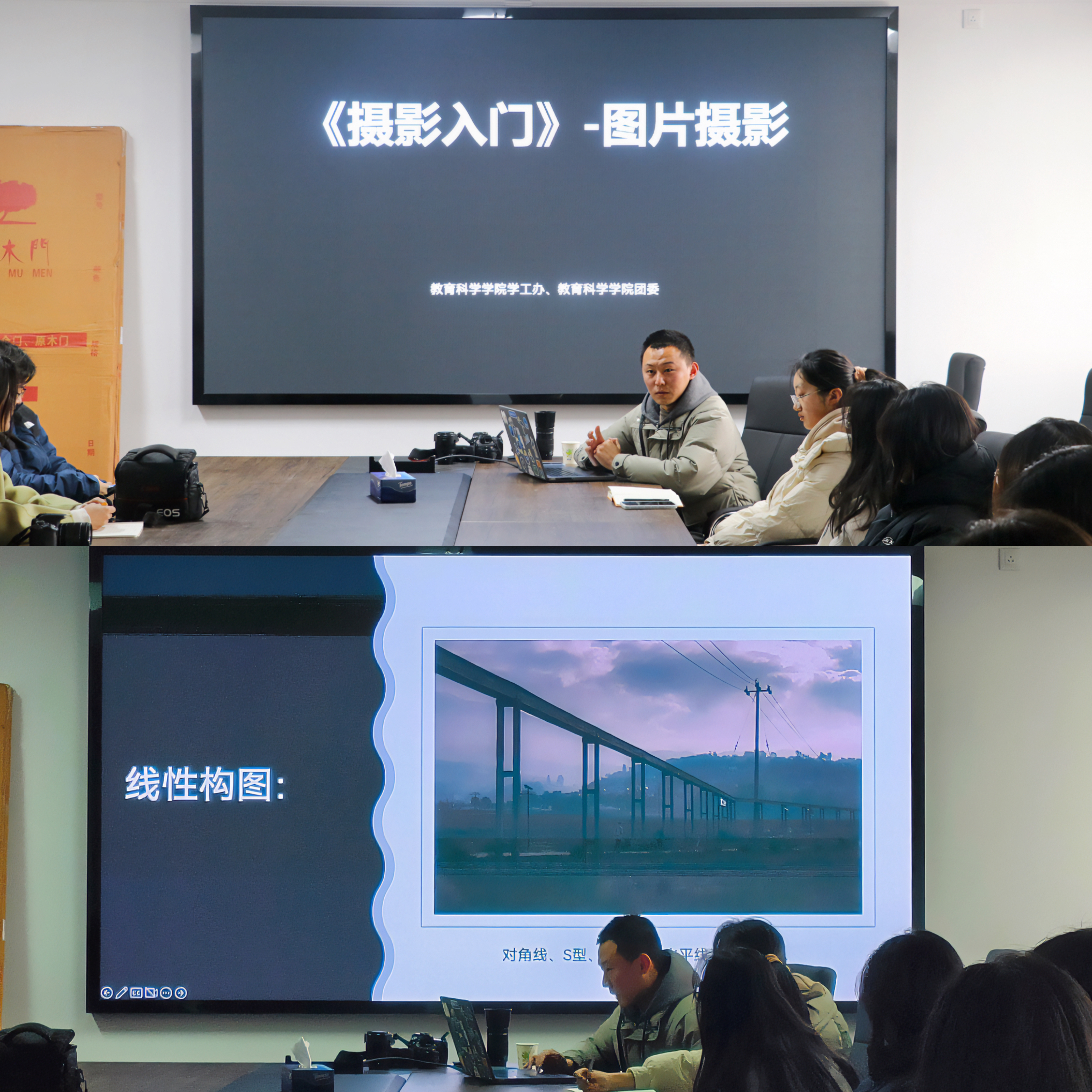 培训伊始,薛冬向员工干部介绍了摄影的定义以及摄影题材的大致分类、摄影术的产生、摄影史的发展等,并向员工干部列出了工作中可能会遇到的问题及其对应的解决方法。薛冬希望员工干部不仅仅将摄影当作一种传媒工具,而是将其作为一种艺术、情感、精神的表达媒介,向教科学子传递积极向上的正能量。