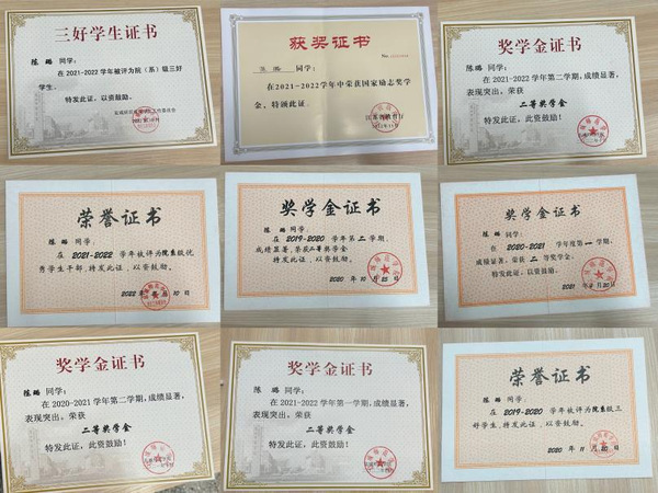 曾获得国家励志奖学金,并多次获得院系级三好员工,二等奖学金,院系级优秀员工干部。