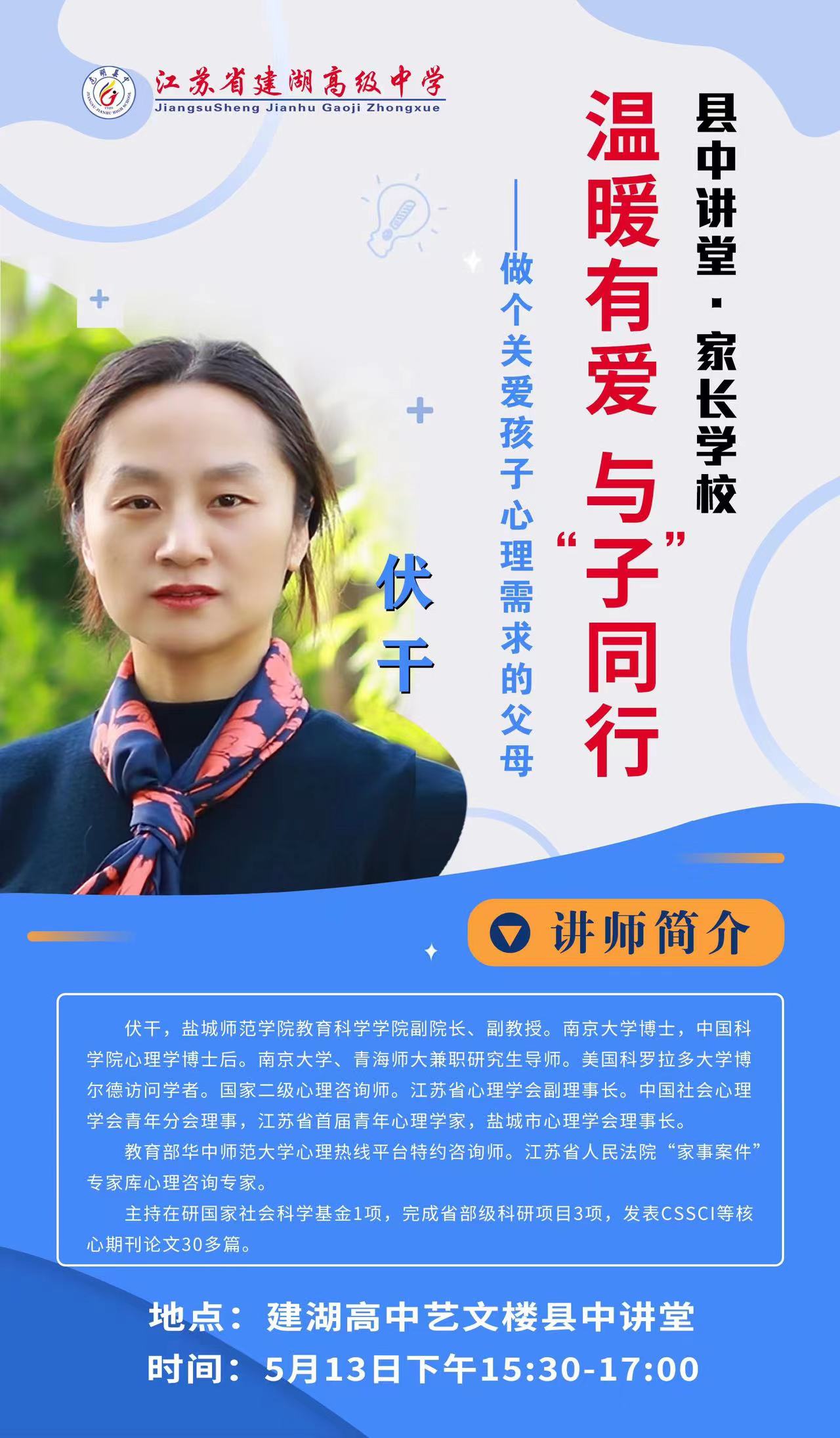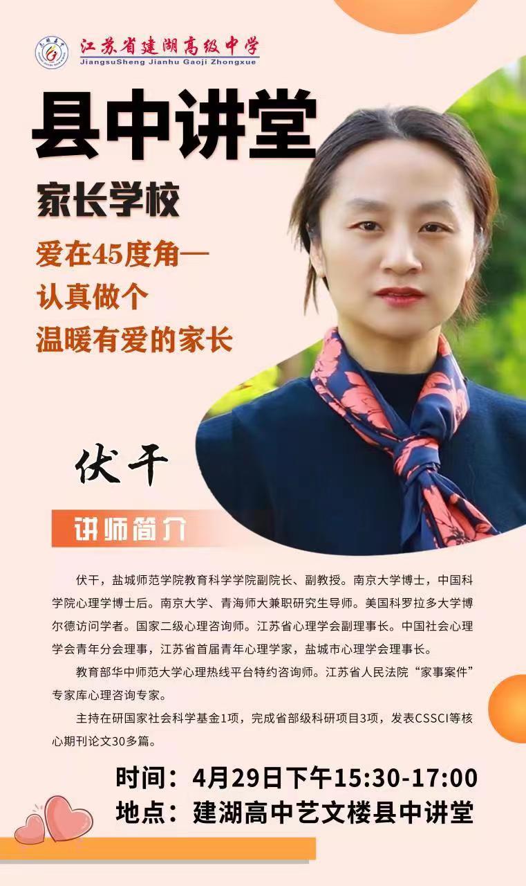 4月15日至5月13日,盐城市心理学会理事长、bw西汉姆联副经理伏干博士受邀为建湖高级中学“县中讲堂 家长公司”开展家庭教育讲座。此次讲座为建湖高级中学的家长和员工带来了新的教育思维,为推动家校共育注入新的动能。