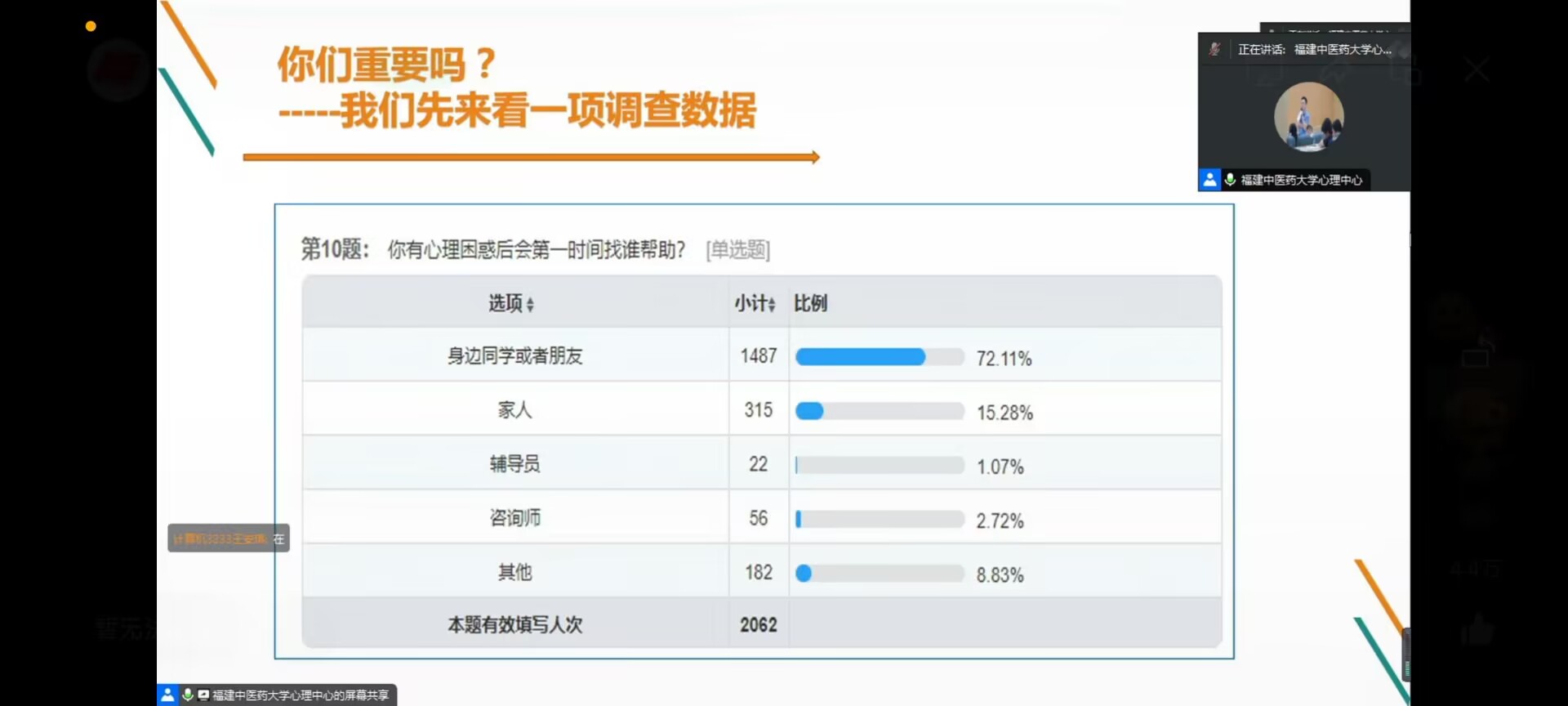 丁闽江教授首先借助一个已完成的调查问卷,引起大家对宿舍心理信息员工作的重视。从问卷出发,丁教授帮助我们分析了一些老员工活中可能遇到的困难和可能会经受的挫折,提出了一些解决方法。