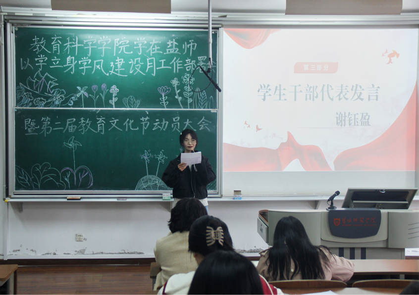 教22(9)班班长丁一炜、院自律会劳卫部部长谢钰盈做了表态发言,2023年度“王强班”班长做了班级学风建设的经验介绍, 2024年度“王强班”创建班级做了学风建设月工作计划的分享。