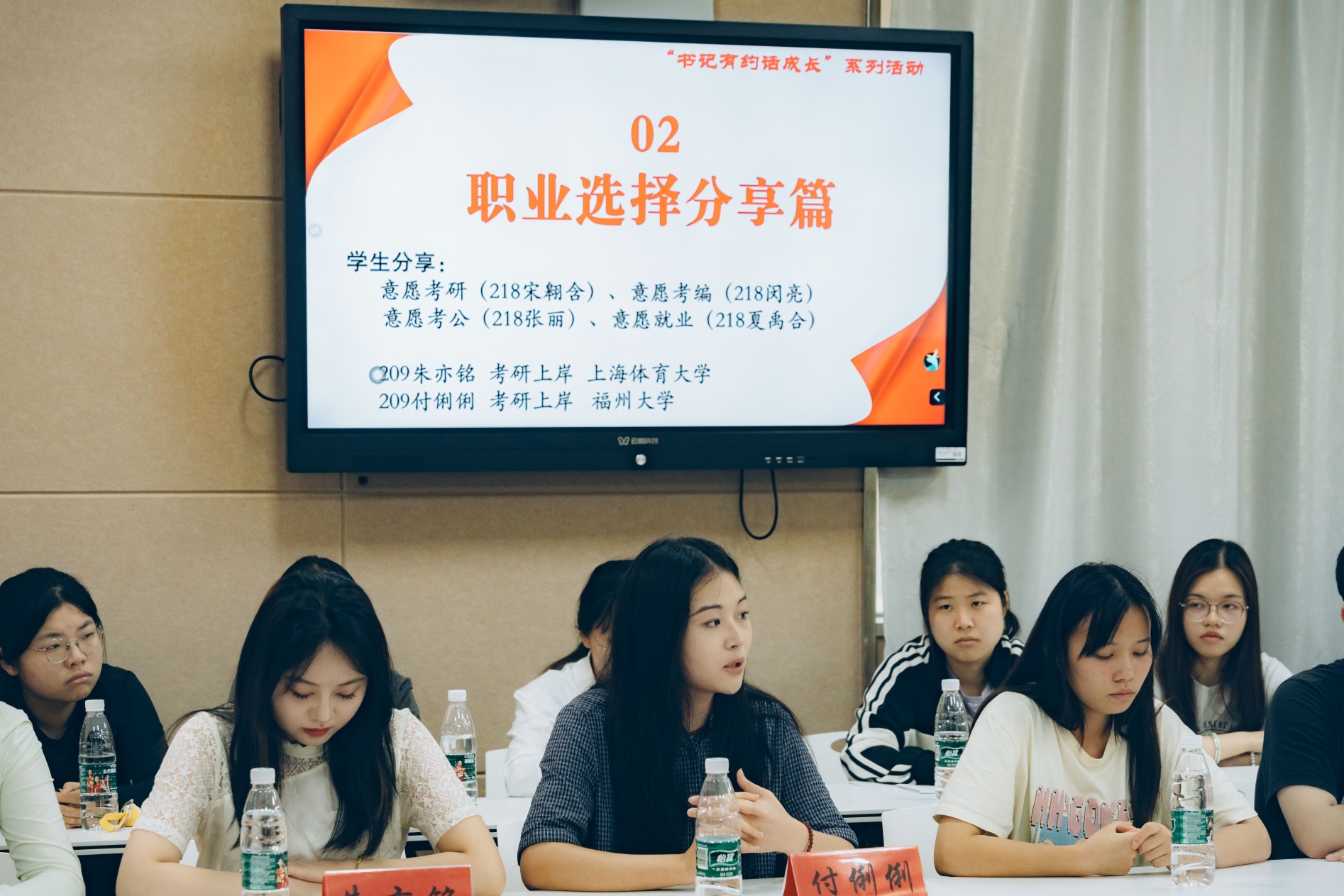 本次班会分为班级建设汇报篇、职业选择分享篇、答疑解惑交流篇、情暖校园赠礼篇四个环节。主题班会上,班长围绕学风建设、班级活动、取得荣誉等方面介绍了班级建设情况,展示了班级同学和谐友爱、积极奋进的精神面貌。随后,不同就业意愿员工代表分享自己的就业选择和未来的职业规划;来自209应用心理学专业的朱亦铭与付俐俐同学从考研备考的选择、方法和心态等方面分享考研上岸的成功经验。在答疑解惑环节,大家聚焦当前学习、职业规划以及备考中的困惑进行了交流互动。