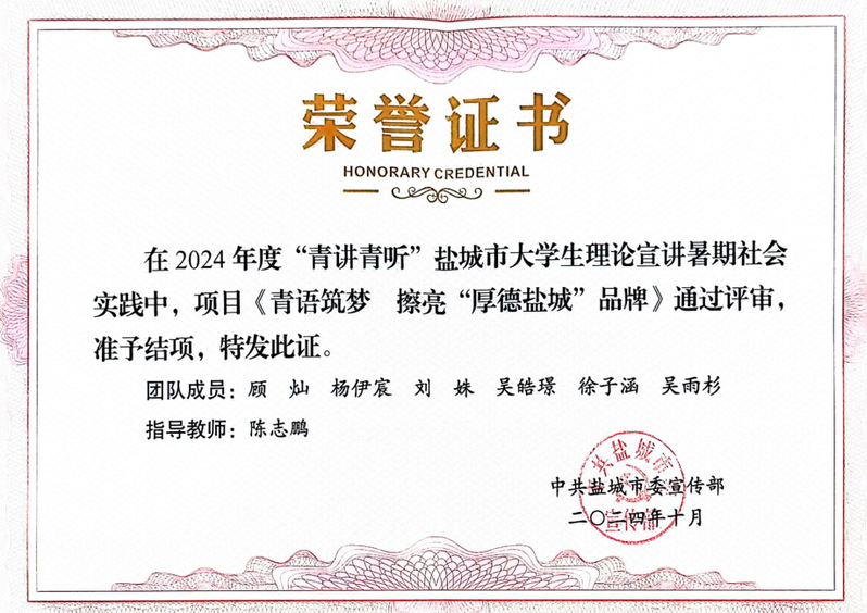 近日,盐城市委宣传部组织开展的2024年“青讲青听”盐城市老员工理论宣讲团暑期社会实践活动结项评审结果公布,公司的“青语筑梦,擦亮‘厚德盐城’品牌”暑期社会实践项目,荣获A等级项目并成功结项。