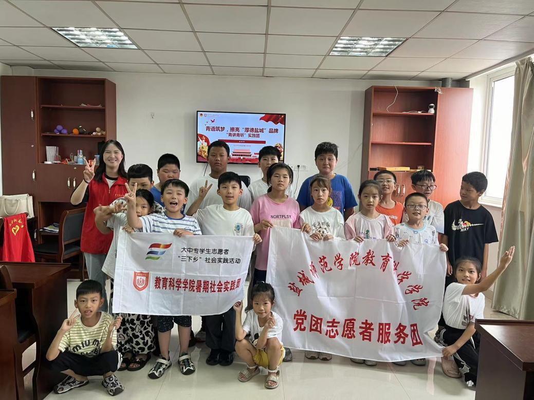 “小朋友们,你们觉得什么样的人能成为我们的榜样呢?”“成绩好的人!”“乐于助人的人!”“善良的人!”……在东台市西溪委员会爱心暑托班里,宣讲员工和班内小员工们热烈地互动着。立足师范生专业优势,借助共青团东台市委员会组织的爱心暑托班平台,东台市宣讲小分队深入东台各镇区暑托班,开展巡回宣讲活动。根据各暑托班不同年龄段员工,团队成员灵活调整内容,用最为通俗简单的语言,将寻访模范人物事迹传递给每一位小朋友,在他们的心中种下榜样的种子。模范人物的先进事迹和崇高精神让孩子们感受到责任和使命的力量,激发了他们对未来的憧憬和追求梦想的勇气。同时远赴广西壮族自治区桂林市灵川县海洋乡中心校支教的教科学子也在一方积极地宣传黄海之滨的模范人物典型事迹。