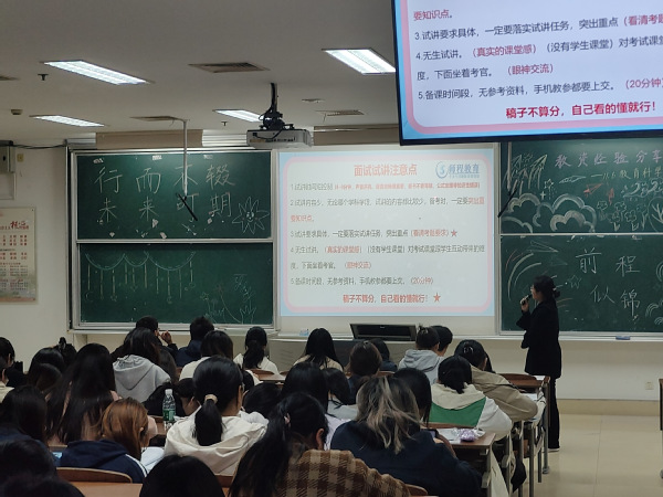 为帮助同学们深入了解教资考试过程,掌握教资考试复习方法及应试技巧,增强备考信心。11月6日晚,公司于主楼B301开展教团队格证经验分享会。本次分享会邀请了教师招聘考试笔试面试资深讲师冯老师,面向公司22级员工开展了教团队格证面试指导分享会。