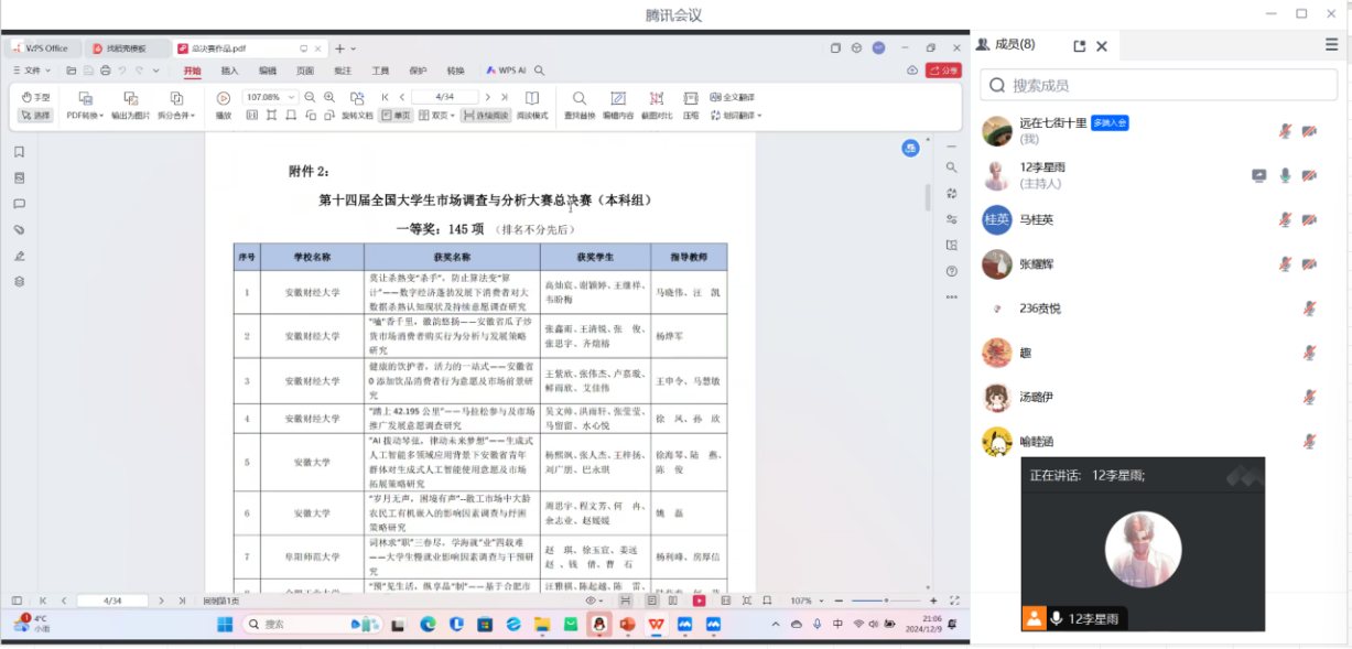 活动以腾讯会议线上形式开展,虽然隔着屏幕,但是拟参赛同学们的热情很高,大家踊跃参与,积极学习。活动由上届获省一等奖组长李星雨同学主持进行,她从大赛内容、主题选择、数据分析、撰写注意事项等多方面进行了阐述和总结。同学们积极响应,询问比赛准备过程中所遇到的各种问题和困惑。主持人进行了细致的回答,在交流过程中,大家深入的互动和探讨,相互学习,共同成长。