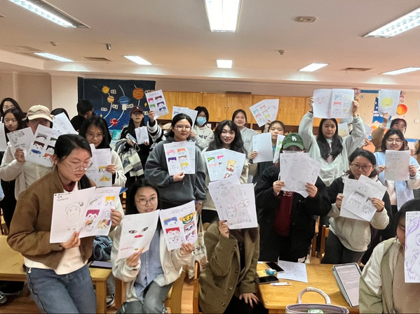 活动最后是作品展示环节。咧嘴笑的三星堆、疑惑的海绵宝宝……每一幅作品都因分享而变得更加生动。活动负责人徐子涵表示:“我们特别设置了无评判的创作空间,希望同学们在安全的环境中学会与情绪共处。”最终,30幅表情涂鸦作品最终绘成了一幅同学们心中共同的“情绪万花筒”,斑斓的色彩映照着年轻心灵的真实脉动。主持人于晨锦总结道:“每抹色彩都是心灵的独白。当我们将难以言说的情绪转化为可视化符号,便开启了自我疗愈的第一扇窗。”