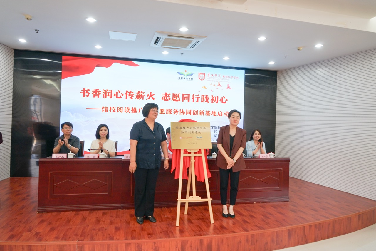 共建仪式上,冯永玲和吕杨为“阅读推广与志愿服务协同创新基地”揭牌,陈晔和韦琴为志愿者代表颁发聘书,王登佐致辞,教科院志愿者代表张琳茗作表态发言。
