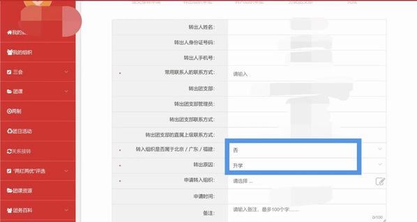 3.进入“关系转接”页面后,根据你转出的具体情况填写蓝色方框区域内的信息。请注意: