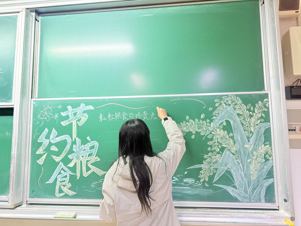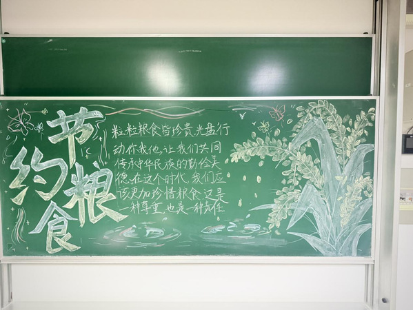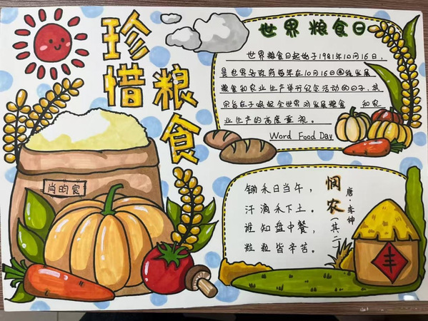 在本次活动中,同学们以画笔为媒,将“珍惜粮食”的朴素道理融入生动创作。黑板报上沉甸甸的稻穗与“粒粒粮食皆珍贵”的倡议相映成趣,手抄报中艺术化的“节约粮食”字样与灵动的蝴蝶水波相得益彰。大家围绕“世界粮食日溯源”“农耕不易”等主题,从满载稻穗的粮袋、饱满的南瓜到童趣的太阳、丰收的粮囤,通过从黑白线稿到色彩斑斓的创作过程,亲身体验和再现了粮食从田间到餐桌的完整历程。这不仅仅是一次艺术实践,更是一堂深刻的生命教育课——让“谁知盘中餐,粒粒皆辛苦”的古训在笔尖焕发新生,使节约粮食的理念在色彩勾勒中升华为情“光盘行动”的自觉,在潜移默化中为青年学子奠定了珍爱劳动成果、崇尚节俭的价值基石。