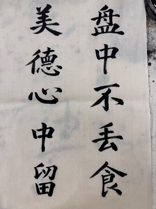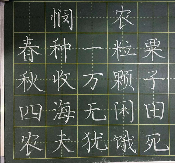 在簌簌粉屑中,农耕文明的厚重底蕴缓缓铺展;在银钩铁画里,对田间劳作的敬畏之情静静流淌;在墨韵淋漓处,勤俭节约的精神风骨傲然挺立。当笔尖与纸面摩挲,书法艺术的刚劲与柔美化作节约粮食的自觉行动;当千年翰香邂逅世代相传的节俭智慧,方寸笔墨不仅锤炼了未来教师的教学基本功,更让“半丝半缕恒念物力维艰”的箴言随墨汁浸润学子心田。