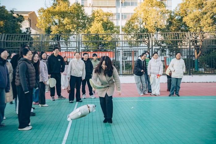 趣味运动比赛环节精彩纷呈。“企鹅漫步”项目中,老师们夹着气球摇摇晃晃前行,引发阵阵笑声。“蒙眼走猫步”则考验搭档间的默契与信任。“踢毽子”项目中,老师们精神集中、脚尖轻点,或变换花样,现场气氛轻松又热闹。