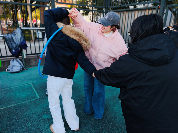 操场上,活力四射,团队协作类活动点燃全场热情。“同心传递”中,同学们手拉手围成圈,在不松手的默契配合中传递呼啦圈,解锁协作密码;“默契脚步”里,双人绑腿并肩前行,在同步节奏中凝聚信任与力量;“接力运球”时,大家屏息凝神,小心翼翼拍飞气球,欢声笑语中拉近心与心的距离。获胜小组收获了甜滋滋的糖果,未获奖的同学也在反复尝试中体会到协作的快乐,整个操场成为充满活力与温情的互动舞台。
